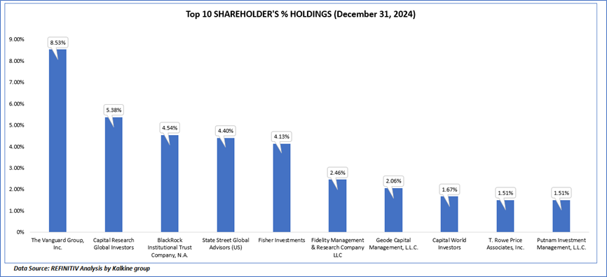 The top 10 shareholders together form ~36.21% of the total shareholding, signifying concentrated shareholding. The Vanguard Group, Inc., and Capital Research Global Investors, are the biggest shareholders, holding the maximum stake in the company at 8.53% and 5.38%, respectively.