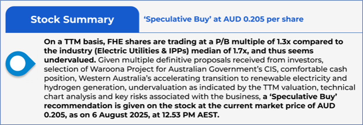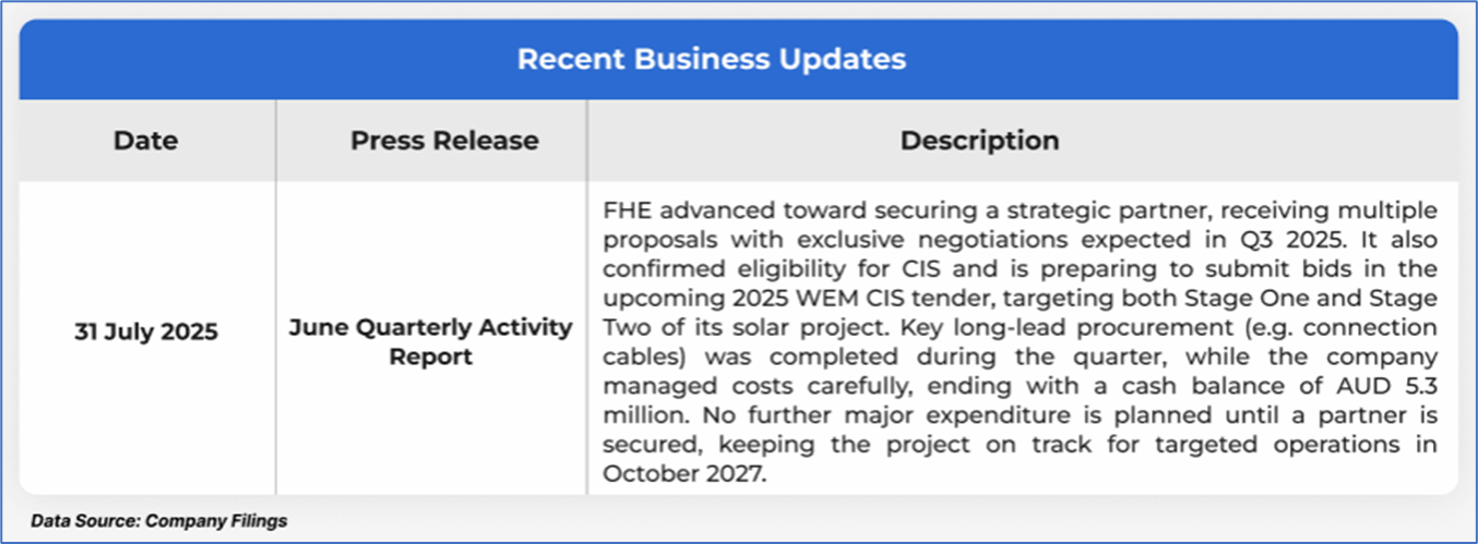 The stock has increased by ~2.0% in the last one month, whereas over the last six months, it has increased by ~70.83%. The stock has a 52-week low and 52-week high of AUD 0.097 and AUD 0.515, respectively, and is currently trading below its 52-week high, low average. FHE was previously covered in a report dated ‘10 July 2025’.