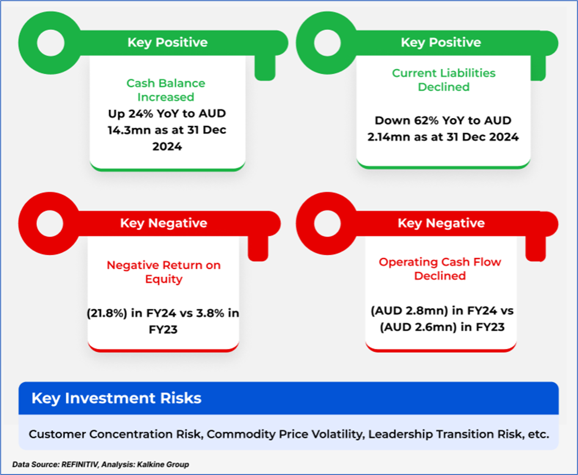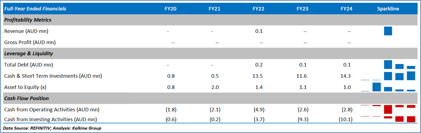 1.4 Key Metrics: At the end of FY24, FHE's cash balance was AUD 14.33mn, up ~24% over pcp. Below are captured other metrics: