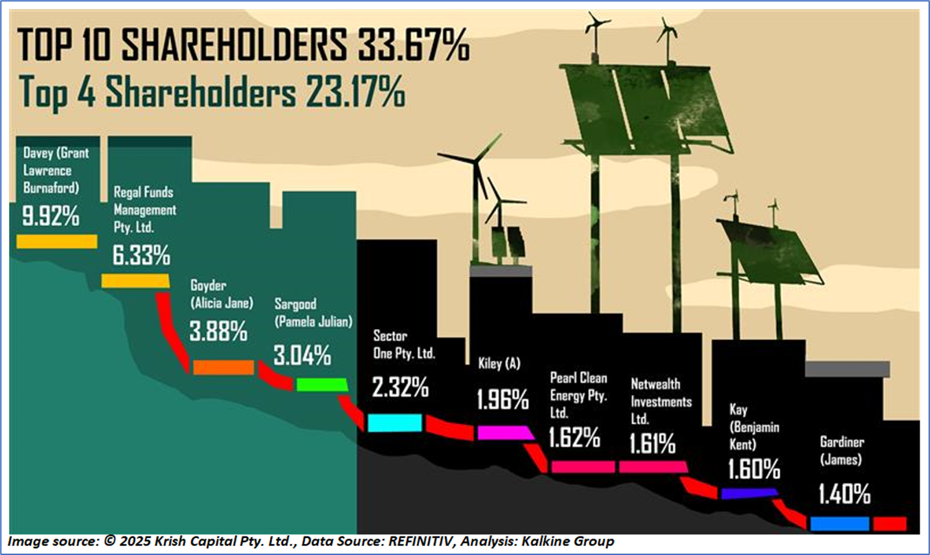 The top 10 shareholders together form ~33.67% of the total shareholding. Davey (Grant Lawrence Burnaford) and Regal Funds Management Pty. Ltd. hold maximum stakes in the company at ~9.92% and ~6.33%, respectively.