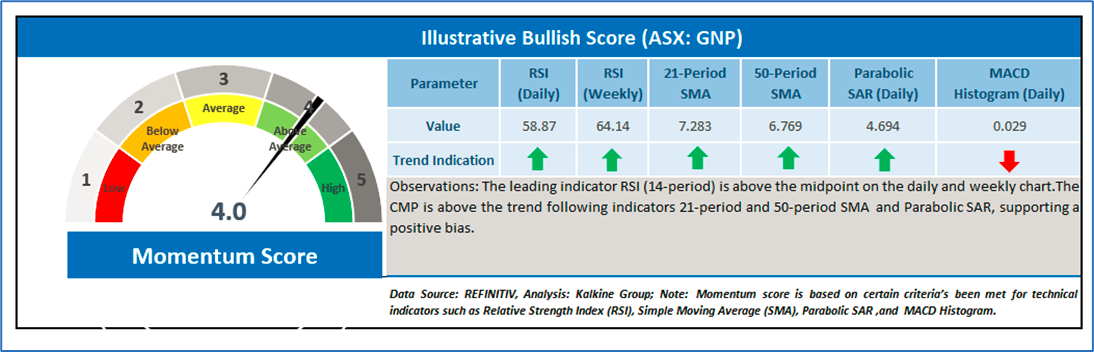 The Report covers the Price Action, Technical Indicators Analysis along with the Target Levels, Stop Loss, and Recommendation on this stock. Noted below is the illustrative momentum score based on technical indicators for the stock: