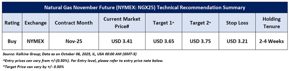As per the previous recommendation on ‘Natural Gas’ on 06 October 2025, a ‘Buy’ rating was given on the Commodity at USD 3.41, and noted below are the details of the recommendation summary provided in the previous report: