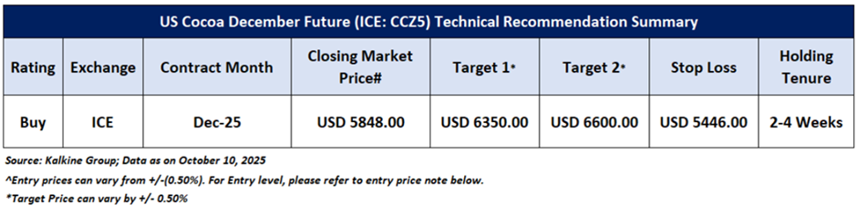 As per the previous recommendation on ‘US Cocoa’ on 13 October 2025, a ‘Buy’ rating was given on the Commodity at USD 5848.00, and noted below are the details of the recommendation summary provided in the previous report: