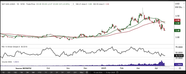 Considering the target levels is yet to achieved, but Natural Gas currently trading near a Support level, and it is prudent to book profits at the current levels. Hence, a ‘Exit’ rating has been provided on the Commodity at the Current Market Price of USD 3.48 as on April 15, 2025 (Chicago, IL, USA 00:00 AM (GMT-5).