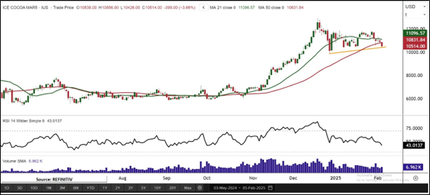 Considering the target levels is yet to achieved, but US Cocoa currently trading near a support level, and it is prudent to book profits at the current levels. Hence, a ‘Exit’ rating has been provided on the Commodity at the Closed Price of USD 10514.00 as on February 05, 2025.
