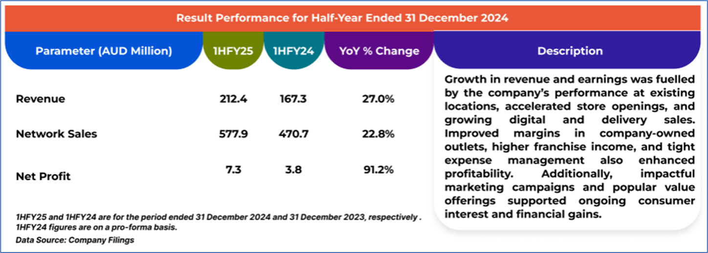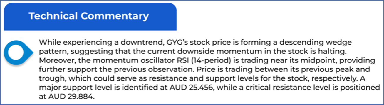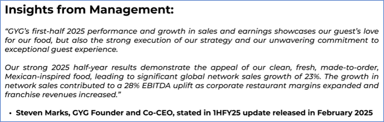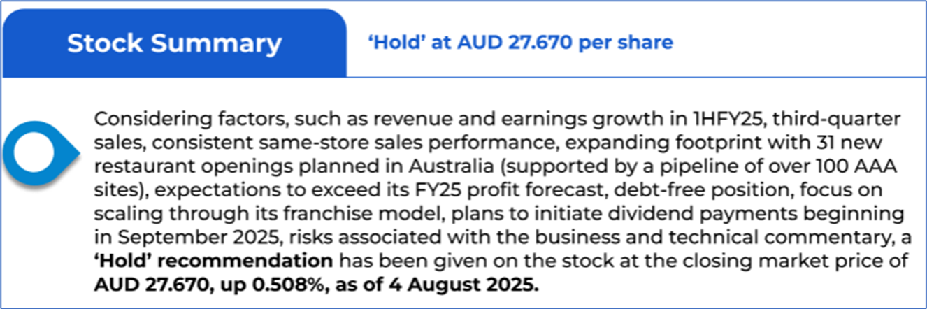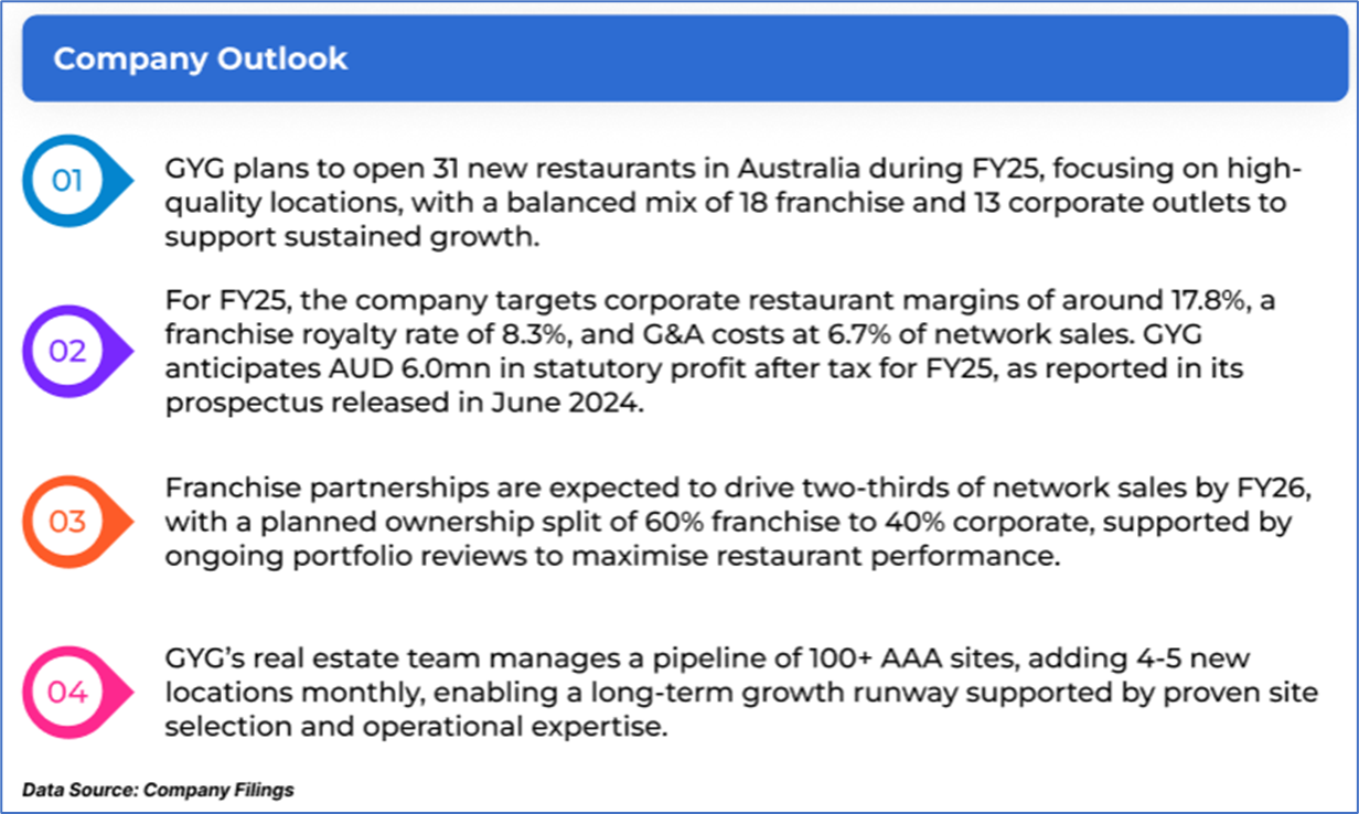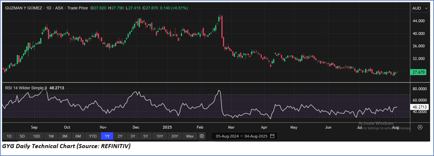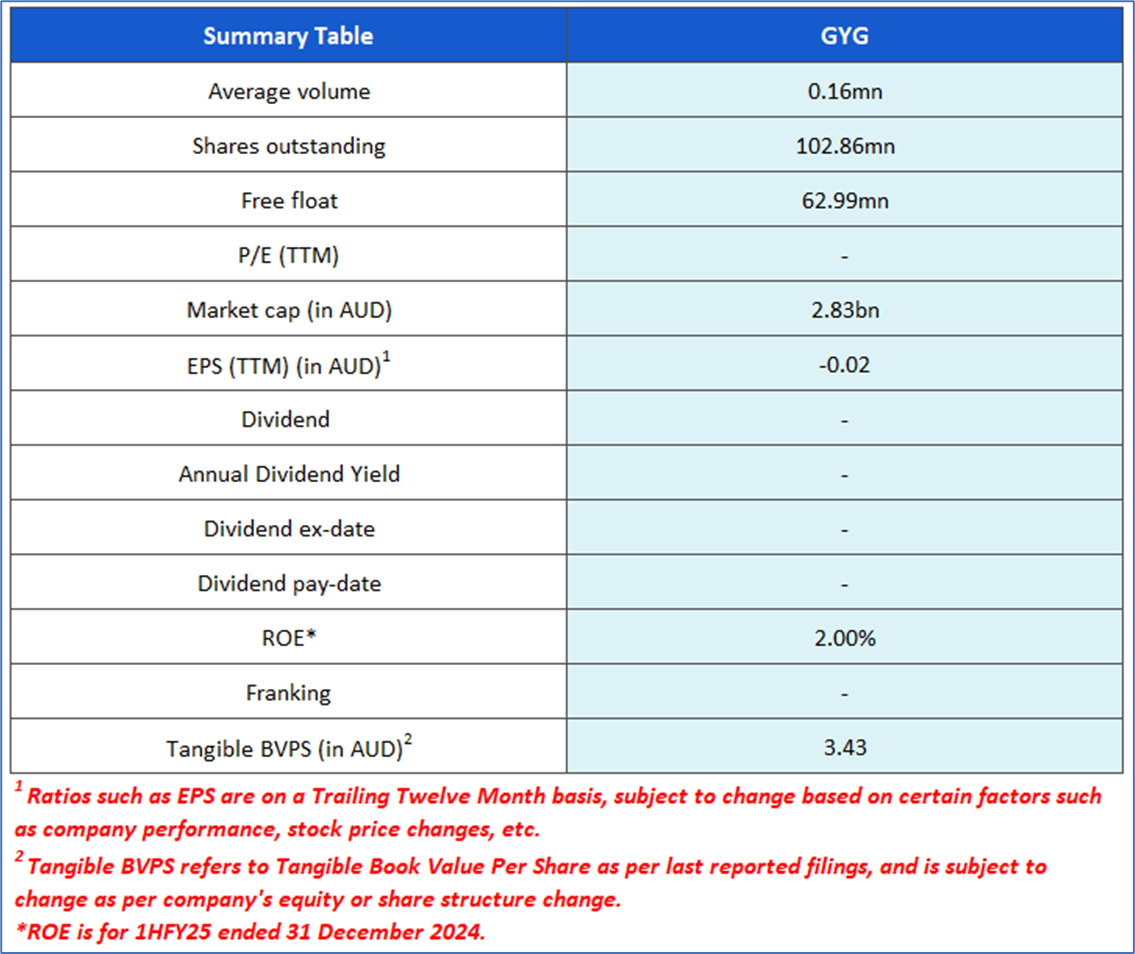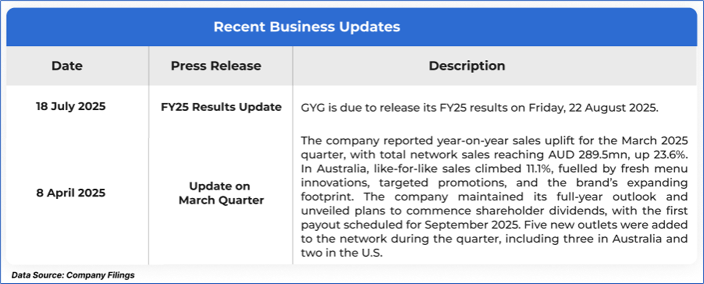 The stock price has gone down by ~0.90% in the last one month and over the last six months, stock prices declined by ~31.68%. The stock has a 52-week low and 52-week high of AUD 26.530 and AUD 45.990, respectively, and is currently trading near the 52-week-low level. GYG was last covered in a report dated ’30 June 2025’.