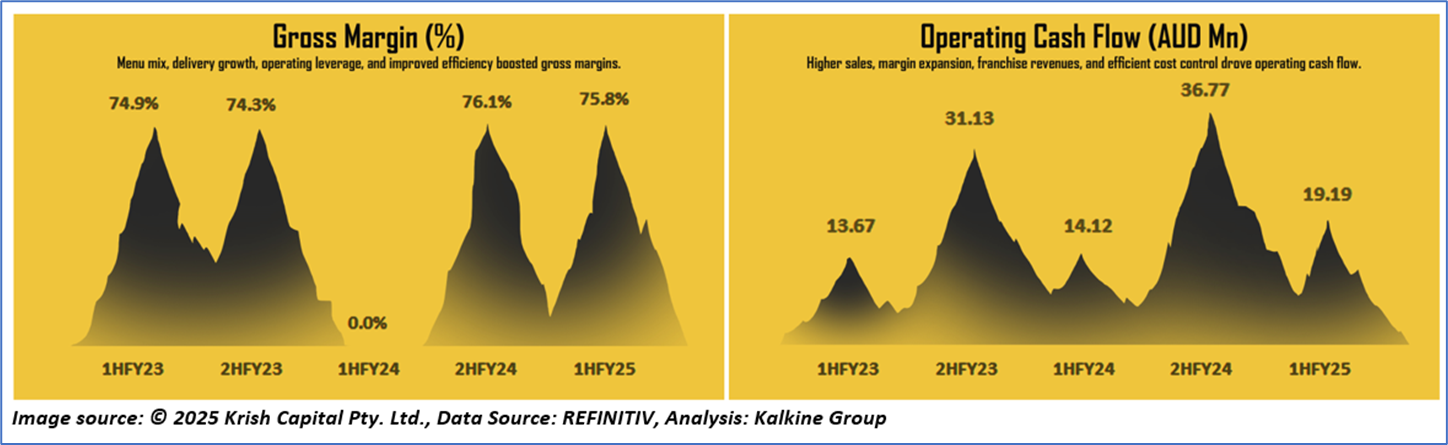 1.4: Key Metrics: GYG operated 239 restaurants globally at the end of 1HFY25. Below is captured the metrics showing the trend of gross margin and operating cash flow: