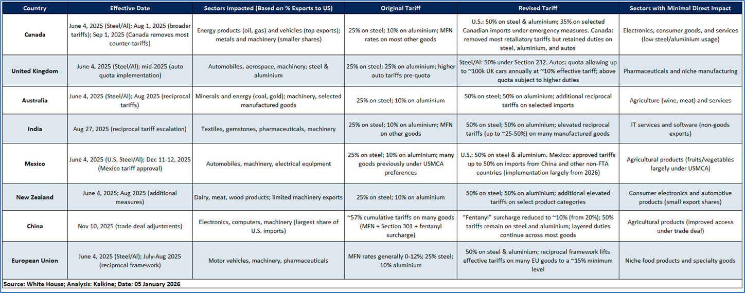 As illustrated in the table below, several key sectors in different countries are directly impacted by the recent tariff announcement from President Trump.