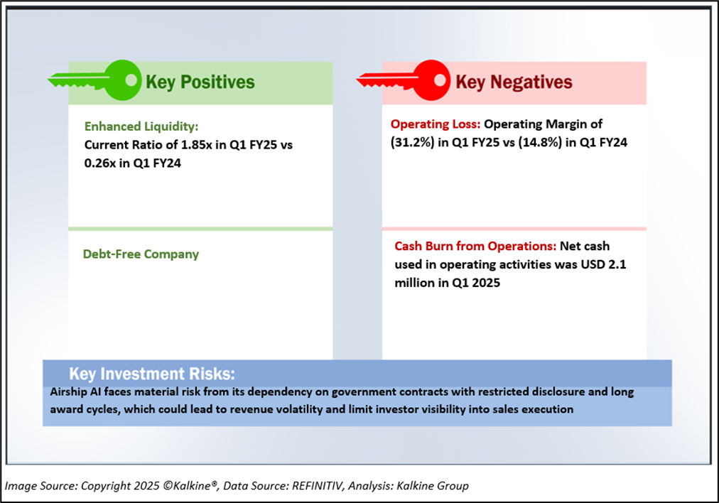 The chart illustrates a significant turnaround in financial performance in Q1 FY25 compared to Q1FY24. Gross Profit Margin increased from 24.9% to 40.6%, reflecting increased solution sales with more third-party hardware than Airship AI software. Despite negative EBITDA and Operating Margins in both periods, Q1FY25 showed improvements from -29.6% to -13.2% and -31.2% to -14.8% respectively. Notably, Income Before Tax Margin and Net Margin swung dramatically from -302.3% to a positive 430.8%, attributed to non-cash gain of USD 25.4 million resulting from changes in the fair value of earnout and warrant liabilities, which more than offset the operating loss incurred during the quarter. Overall, the company demonstrated a strong rebound in profitability metrics.