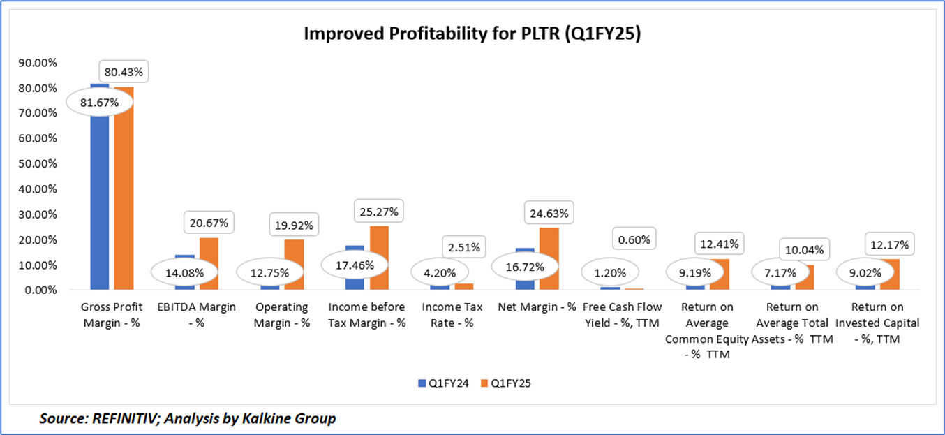 Palantir Technologies Inc. (NASDAQ: PLTR) demonstrated significant improvements in profitability and efficiency in Q1 FY2025 compared to Q1 FY2024, despite a slight decline in gross profit margin from 81.67% to 80.43% due to increased costs. The company’s EBITDA margin rose from 14.08% to 20.67% and operating margin increased from 12.75% to 19.92%, reflecting enhanced operational efficiency driven by strong revenue growth (39% YOY to USD884 million) and cost management. Income before tax margin improved from 17.46% to 25.27%, and net margin grew from 16.72% to 24.63%, bolstered by a reduced income tax rate from 4.20% to 2.51%, indicating higher profitability and tax efficiency. Additionally, return on average common equity (9.19% to 12.41%), return on average total assets (7.17% to 10.04%), and return on invested capital (9.02% to 12.17%) all improved significantly, showcasing better capital utilization and shareholder value creation. However, the trailing twelve-month free cash flow yield dropped from 1.20% to 0.60%, likely due to increased capital expenditures or stock price appreciation, suggesting a potential concern for investors focused on cash flow returns relative to market valuation.