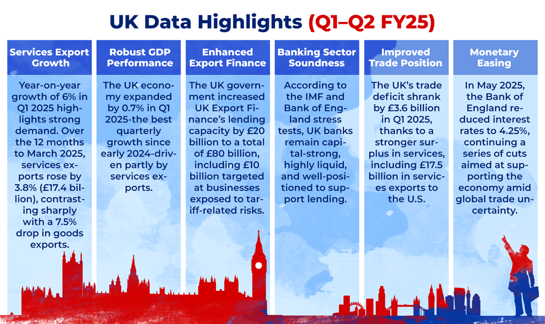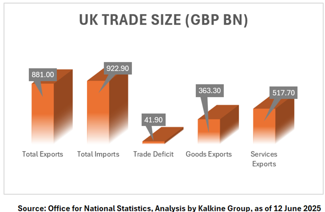 UK closed first quarter of 2025 with a trade deficit of GBP ~41.90 bn. Total exports reached GBP ~881.00 billion, while imports stood at GBP ~922.90 billion.