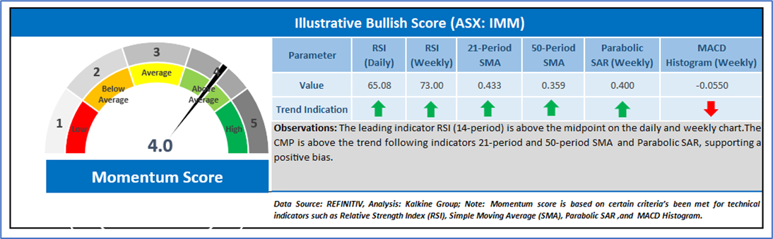 Company Overview: Immutep Limited (ASX: IMM) is an Australia-based biotechnology company. The company's primary focus is developing immunotherapies for cancer and autoimmune diseases that target the Lymphocyte Activation Gene (LAG)-3. The Report covers the Price Action, Technical Indicators Analysis along with the Target Levels, Stop Loss, and Recommendation on this stock. Noted below is the illustrative momentum score based on technical indicators for the stock: