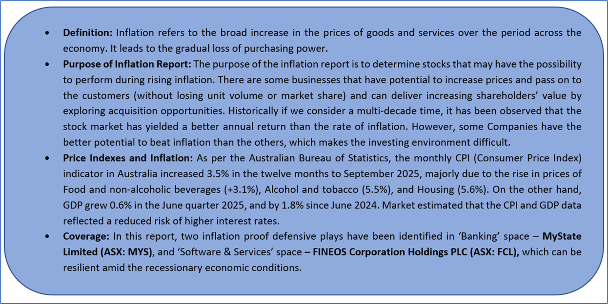Company Overview: MyState Limited (ASX: MYS) provides banking, trustee and managed fund products and services through its wholly owned subsidiaries, MyState Bank Limited (MyState Bank) and TPT Wealth Limited (TPT Wealth). FINEOS Corporation Holdings PLC (ASX: FCL) is a global software company providing core systems for life, accident and health insurance (LA&H) carriers globally. Established in 1993, this ASX-listed company works with innovative, progressive insurers in North America, EMEA, and Asia-Pacific. Kalkine’s Inflation Report covers the Investment Highlights, Key Financial Metrics, Risks, Outlook, Technical Analysis along with the Valuation, Target Price, and Recommendation on these two stocks.
