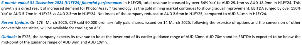 The stock is down by ~21.62% in last six months, and over the past one year, it has decreased by ~32.01%. The stock has a 52-week low and 52-week high of AUD 4.260 and AUD 7.150, respectively, and is currently trading below the 52-week high-low average. C79 was last covered in a report dated ‘17 February 2025’.