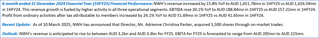 The stock has witnessed a correction of ~26.05% in last three months, and over the past one year, it decreased by ~7.57%. The stock has a 52-week low and 52-week high of AUD 2.660 and AUD 4.025, respectively, and is currently trading below the 52-week high-low average. NWH was last covered in a report dated ‘10 February 2025’.