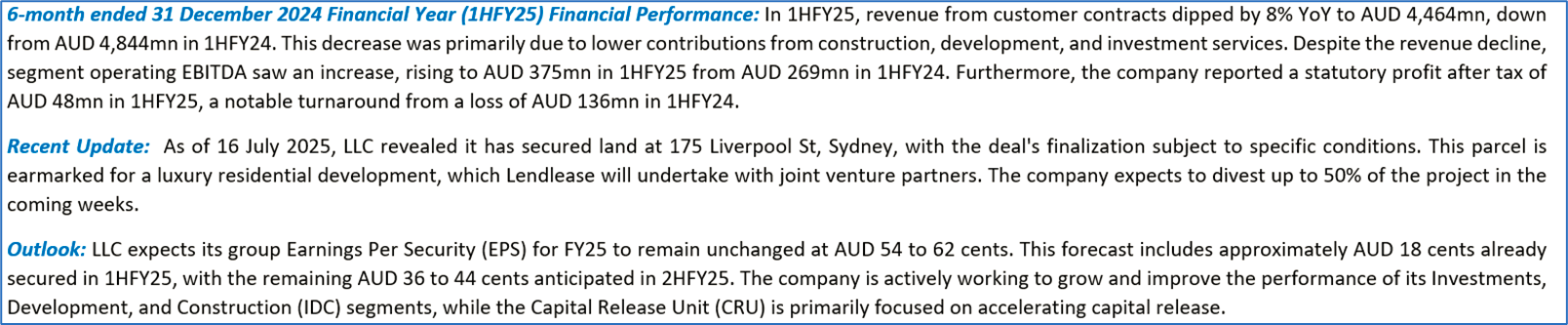 1) Lendlease Group (ASX: LLC) (Recommendation: ‘Buy’ at AUD 5.200, Potential Upside: Low Double-Digit) (M-cap: AUD 3.58bn)