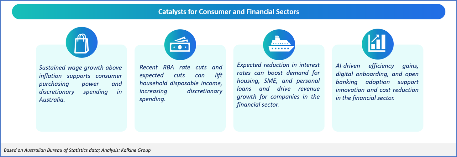Australia’s consumer sector spans retail, fast-moving consumer goods (FMCG), and discretionary services, serving as a key driver of domestic demand. It is supported by population growth, high urbanisation, and a well-developed logistics network. The sector is highly competitive, with major players like Woolworths, Wesfarmers, and Coles dominating essentials, while global entrants intensify pressure in discretionary retail. Key trends include digital transformation, value-conscious spending, and demand for sustainable and locally sourced products. Consumer sentiment is closely tied to interest rates, wage growth, and cost-of-living pressures. Despite macroeconomic headwinds, the sector remains agile, adapting through omnichannel strategies and innovation to maintain relevance.