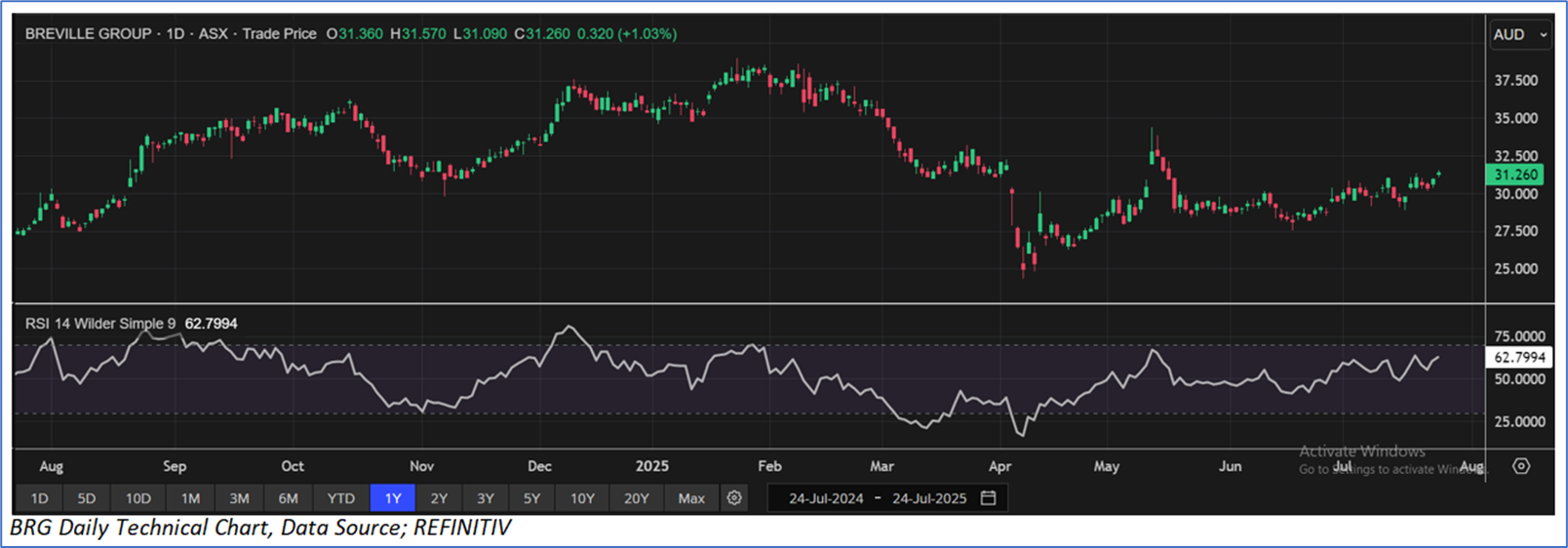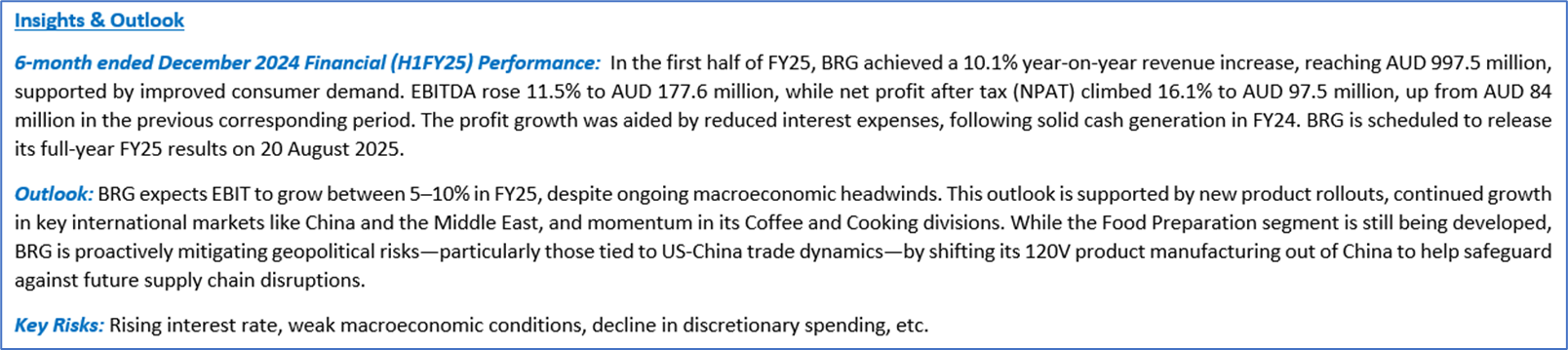 The stock has witnessed a growth of ~13.51% in last three months, and over the past six months, it has declined by ~16.73%. The stock has a 52-week low and 52-week high of AUD 24.330 and AUD 39.000, respectively and is currently trading close to its 52-week high-low average. BRG was last covered in a report dated ‘12 June 2025’.
