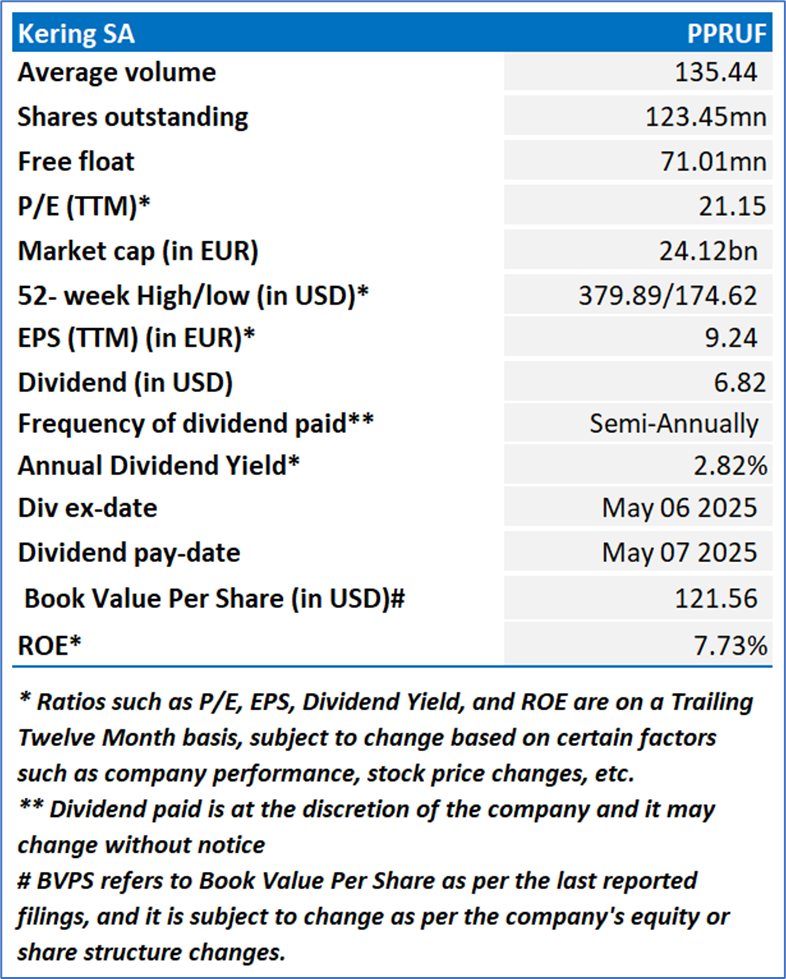 Kering SA (OTC: PPRUF) is a France-based company that mainly active in fashion group on luxurious branded products. The Group manages the development of a series of renowned Houses in Fashion, Leather Goods and Jewelry: Gucci, Saint Laurent, Bottega Veneta, Balenciaga, Alexander McQueen, Brioni, Boucheron, Pomellato, DoDo, Ginori 1735, as well as Kering Eyewear and Kering Beaute.