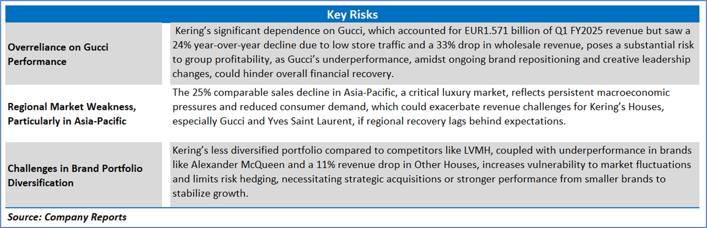 Kering (PPRUF) exhibited a mixed financial trajectory from 2020 to 2024, with revenue from business activities growing at a 4-year CAGR of 5.59%, rising from EUR13,100.2 million in 2020 to a peak of EUR20,351 million in 2022, before declining to EUR17,194 million in 2024, reflecting macroeconomic challenges and reduced luxury demand, particularly in Asia-Pacific. Gross profit followed a similar trend, increasing at a 4-year CAGR of 5.92% from EUR9,509.6 million in 2020 to EUR15,198 million in 2022, but falling to EUR12,681 million in 2024 due to a 14% revenue drop in Q1 FY2025 and ongoing pressures on Gucci’s performance (24% YOY decline). The gross margin improved from 72.59% in 2020 to a high of 76.29% in 2023, driven by premium brand positioning and operational efficiencies, before slightly declining to 73.75% in 2024, impacted by product mix shifts and lower sales volumes. Strategic initiatives, including EUR1.187 billion in real estate divestitures in Q1 FY2025 and leadership changes like Luca de Meo’s appointment as CEO, bolster Kering’s financial flexibility and long-term growth potential, though persistent regional weaknesses and a 55.98% drop in return on equity from its 10-year average highlight risks to profitability amidst a cyclical luxury market downturn.