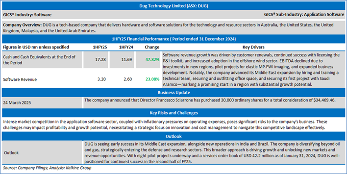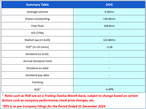 The stock has decreased by ~29.84% in last three months, and over the last six months, it has moved down by ~58.48%. The stock has a 52-week low and 52-week high of AUD 0.850 and AUD 3.290, respectively and is currently trading below the 52-week high-low average. DUG was last covered in a report dated ’20 March 2025’.
