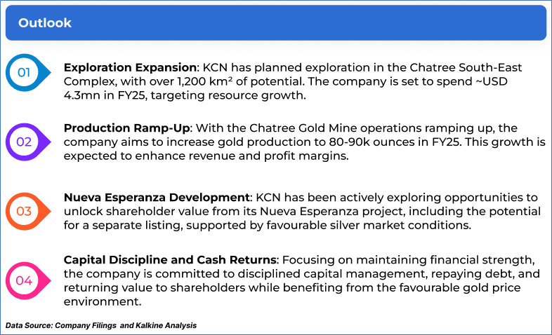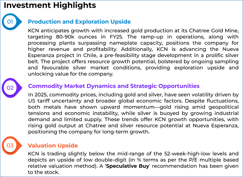 1.1: Company Overview: Kingsgate Consolidated Limited (ASX: KCN) is an Australian gold and silver producer, known for its Chatree Gold Mine in Thailand and the Nueva Esperanza Gold-Silver Project in Chile's Maricunga Belt. With extensive experience in gold exploration, development, and mining, Kingsgate is a key player in the Pacific Rim region. The company focuses on advancing its portfolio of high-quality, high-potential gold and silver assets. Kalkine’s Gold Report covers the Investment Highlights, Management Insights, Key Financial Metrics, Risks, Technical Analysis along with the Valuation, Target Price, and Recommendation on the stock.