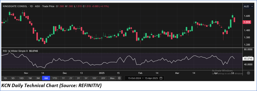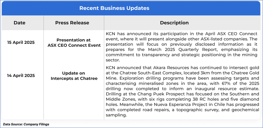 The stock price has gone down by ~7.40% in the last one month and over the last six months, stock prices declined by ~11.94%. The stock has a 52-week low and 52-week high of AUD 1.160 and AUD 1.885, respectively, and is currently trading slightly below the mid-range of the 52-week-high-low levels. KCN was last covered in a report dated ‘10 March 2025’.