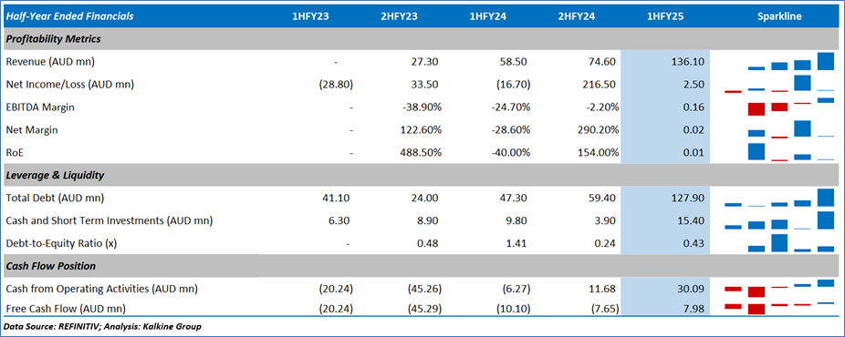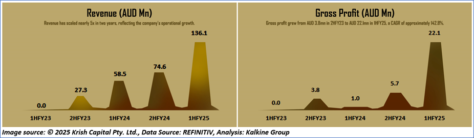 1.4: Key Metrics: KCN registered AUD 136.1mn in revenue for 1HFY25 vs AUD 58.5mn for 1HFY24. Below is captured the metrics showing the trend of revenue and gross profit since 1HFY23: