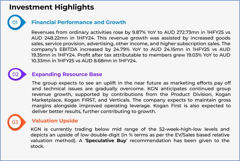 1.1: Company Overview: Kogan.com Ltd (ASX: KGN) operates a diverse portfolio of retail and service businesses, encompassing Kogan Retail, Kogan Marketplace, Kogan Mobile, Kogan Internet, Kogan Insurance, Kogan Money, Kogan Energy, Kogan Travel, Dick Smith, Matt Blatt, Mighty Ape, and Brosa. Kalkine’s Penny Stocks Report covers the Investment Highlights, Key Financial Metrics, Risks, and Technical Analysis along with the Valuation, Target Price, and Recommendation on the stock.
