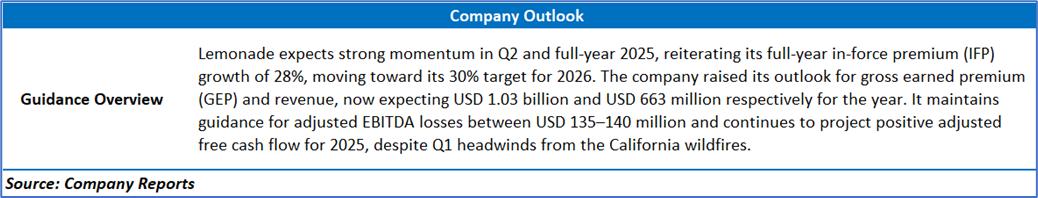 The graph shows a steady increase in revenue from Q1 FY24 (USD 119.1 million) to Q1 FY25 (USD 151.2 million), mainly attributed to higher gross earned premiums, increased ceding commission income, and stronger net investment income Despite this growth, the company consistently reported net losses each quarter, peaking at USD -67.7 million in Q3 FY24 and narrowing to USD -30.0 million in Q4 FY24 before rising again to USD -62.4 million in Q1 FY25. This is due to higher growth-related expenses and the effects of the California wildfires and FAIR Plan assessment, partially offset by increased revenue.