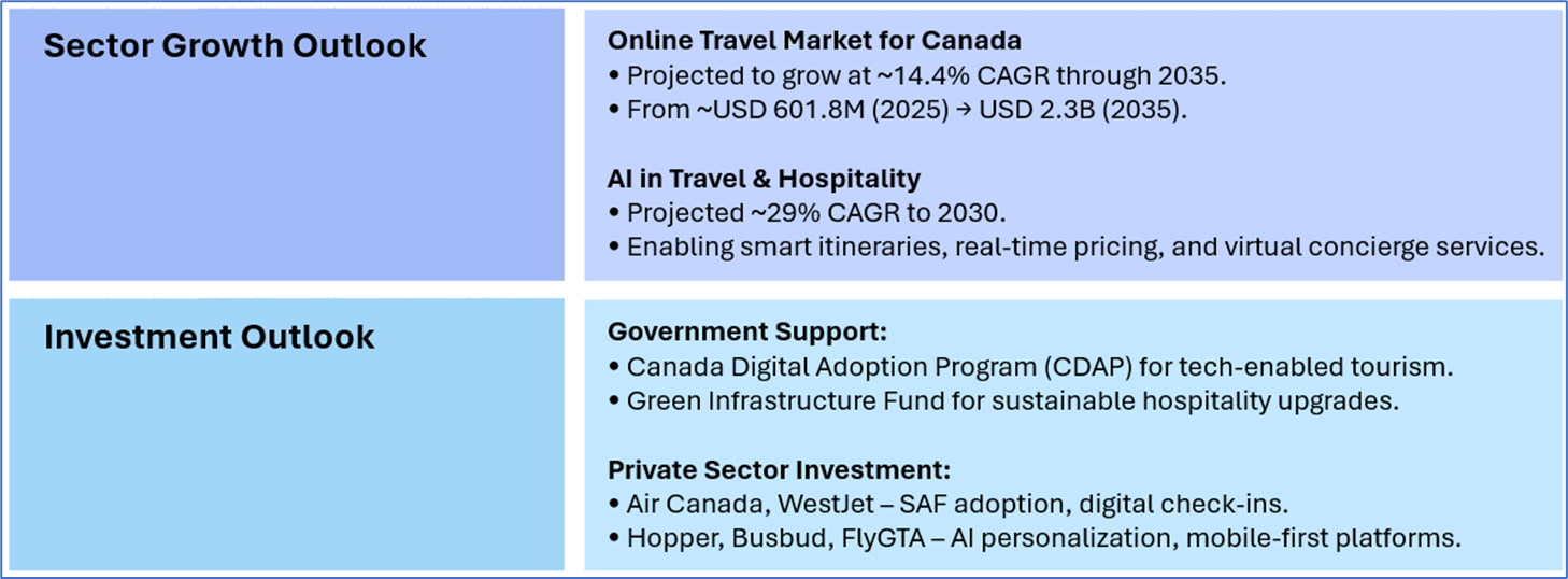 Canada's Travel and Leisure sector in 2025 is resilient and growth-oriented, driven by digital transformation (particularly AI integration), a decent push for sustainability, favorable government policies, and renewed demand from both domestic and international travelers. The sector spans a diverse value chain including airlines, hotels, digital travel platforms, entertainment, gaming, casinos, retail, and consumer discretionary, each playing a vital role in reshaping travel experiences. Growth is further fueled by rising immigration, increased urban mobility, and a shift toward personalized, health-secure, and eco-conscious travel. While challenges like labor shortages, infrastructure gaps, and regulatory uncertainties remain, the sector’s outlook remains positive, hinging on its ability to scale innovation, attract investment, and expand capacity.