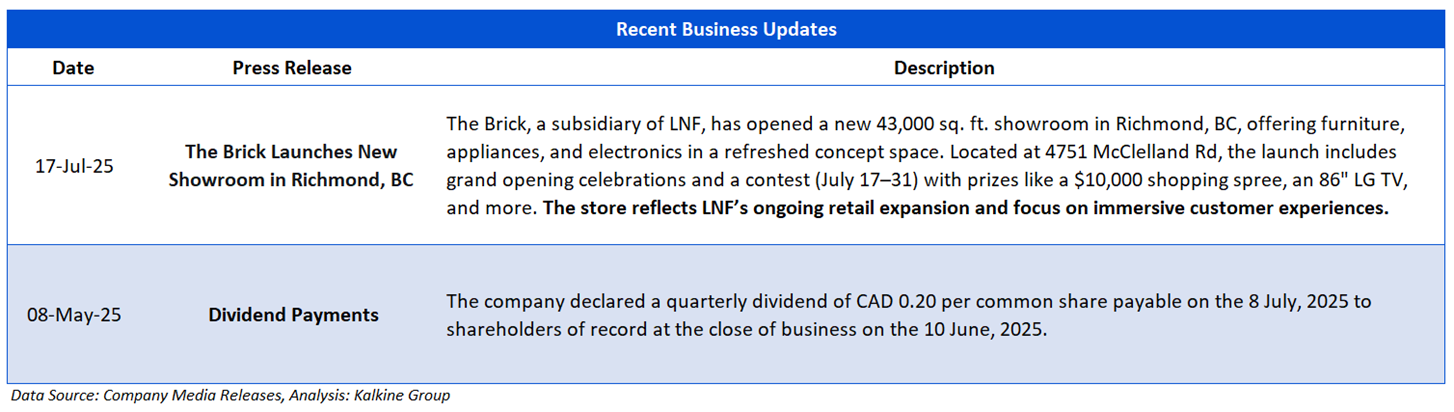 The picture below gives an overview of the company’s recent activities, such as an update on the Brick Launches New Showroom in Richmond, BC and dividend payments.