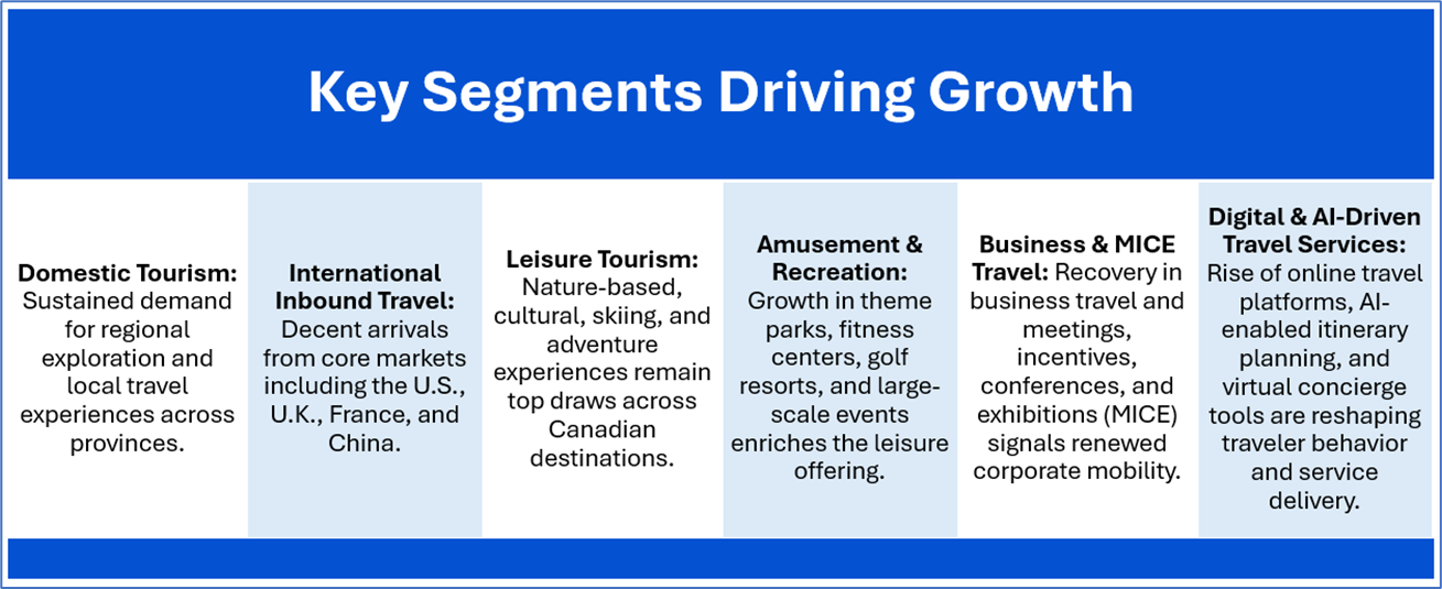 Canada’s travel and leisure industry appears set for steady growth, supported by sustainable local demand, the revival of international arrivals, and favorable government policies. Ongoing improvements in infrastructure, growing consumer interest, and rising focus on eco-friendly and immersive travel experiences are creating attractive prospects for both businesses and investors. That said, challenges such as staffing gaps, rising operational costs, and global economic headwinds will require careful navigation. Despite these hurdles, the sector’s long-term outlook remains optimistic, as Canada continues to enhance its appeal as a top-tier destination in the post-COVID landscape.