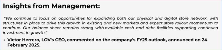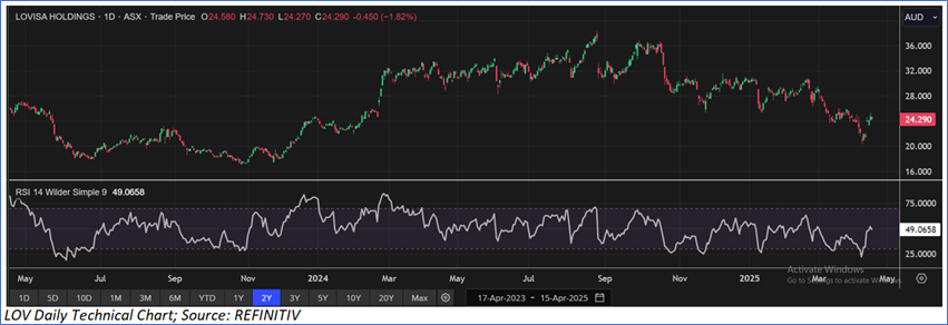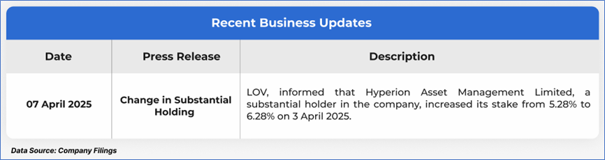 The stock has declined by ~32.52% in the last six months, whereas over the last nine months, the stock has corrected by ~27.52%. The stock has a 52-week low and 52-week high of AUD 20.23 and AUD 38.29, respectively, and is currently trading below the mid-point of its 52-week low and high. LOV was last covered in a report dated ‘18 March 2025’.