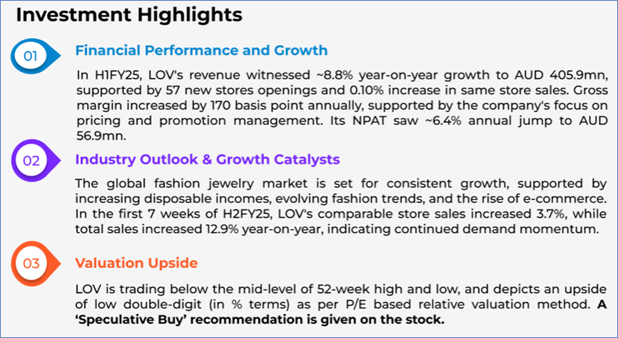 Company Overview: Lovisa Holdings Limited (ASX: LOV) is an Australia-based global fashion jewelry retailer. The company designs, develops, and retails affordable and trend-driven jewelry and accessories. Kalkine’s Growth Report covers the Investment Highlights, Management Insights, Key Financial Metrics, Risks, Technical Analysis along with the Valuation, Target Price, and Recommendation on the stock.