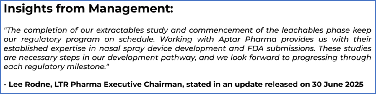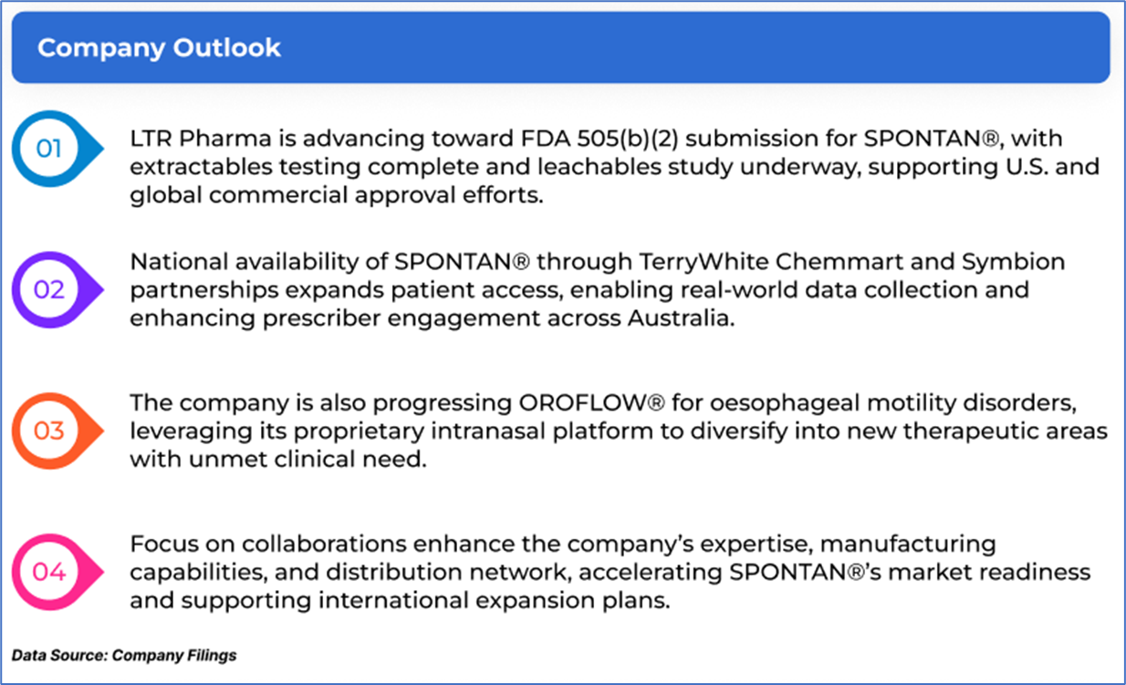 1.1: Company Overview: LTR Pharma Limited (ASX: LTP) is an Australian biopharmaceutical company focused on the development and early access of SPONTAN®, a first-in-class rapid nasal spray for Erectile Dysfunction (ED). The company has achieved positive clinical outcomes, entered early access pathways, and formed strategic global partnerships, including with Aptar Pharma. Kalkine’s Healthcare Report covers the Investment Highlights, Management Insights, Key Financial Metrics, Risks, Technical Analysis along with the Valuation, Target Price, and Recommendation on the stock.