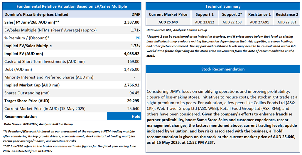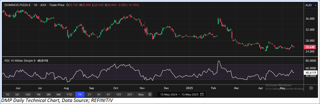 The stock has witnessed a correction of ~10.98% in last three months, and over the past six months, it has increased by ~31.29%. The stock has a 52-week low and 52-week high of AUD 23.880 and AUD 39.340, respectively and is currently trading below the 52-week high-low average. DMP was last covered in a report dated ‘17 April 2025’.