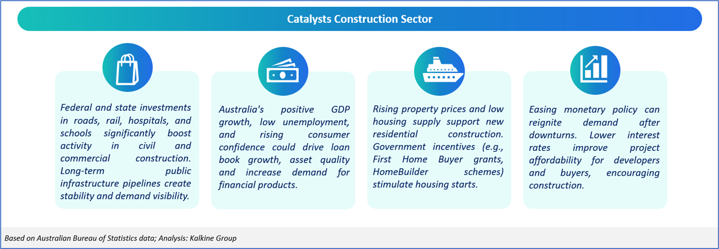 Australia’s construction sector is a vital pillar of the economy, encompassing residential, commercial, and infrastructure development. It contributes significantly to employment and GDP, driven by population growth, urbanisation, and government infrastructure investment. The sector is recently experiencing a surge in demand, particularly in housing and civil projects, but faces challenges such as labour shortages, cost inflation, and supply chain disruptions. Long-term growth is supported by migration-led housing demand, decarbonisation initiatives, and digital transformation. While economic cycles and interest rate fluctuations influence activity levels, the sector’s resilience is underpinned by structural drivers and continued public and private sector investments.