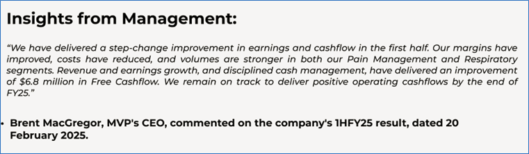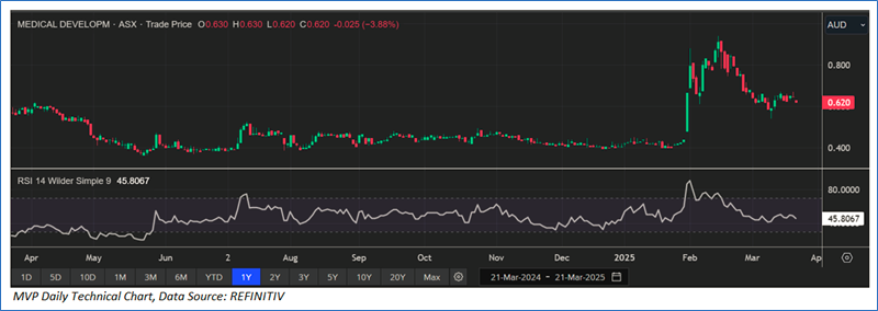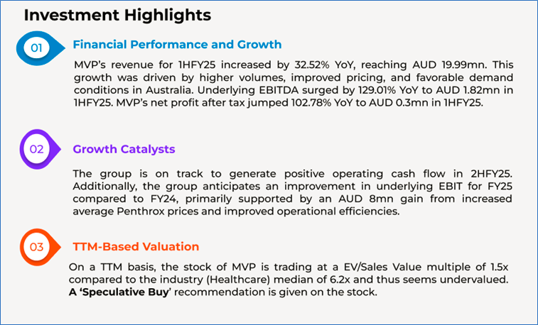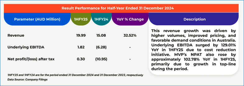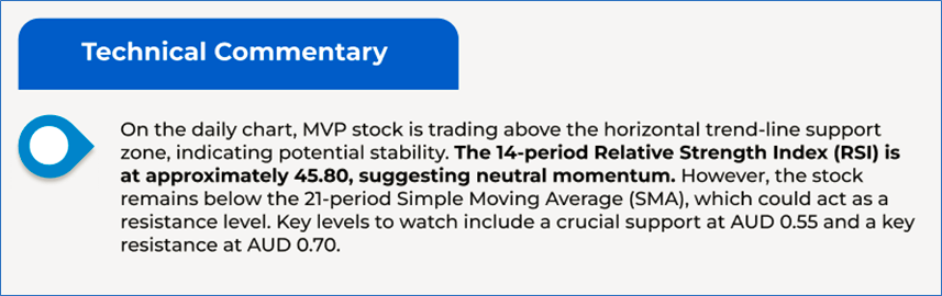 The stock has decreased by ~18.95% in the last one month, and over the past one year, stock has moved up by ~8.80%. The stock has a 52-week low and 52-week high of AUD 0.365 and AUD 0.940, respectively, and is currently trading below the 52-week high-low average. MVP was last covered in a report dated ‘03 February 2025’.