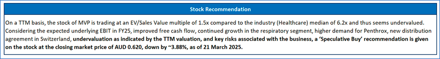 1.1: Company Overview: Medical Developments International Limited (ASX: MVP) is an Australian company specializing in emergency medical solutions aimed at enhancing patient outcomes. MVP offers emergency pain relief and respiratory products, including Penthrox®, a fast-acting, non-opioid treatment for pain relief in trauma and emergency situations. Kalkine’s Penny Stocks Report covers the Investment Highlights, Key Financial Metrics, Risks, and Technical Analysis along with the Valuation, Target Price, and Recommendation on the stock.