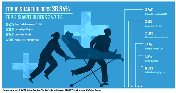 The top 10 shareholders together form ~36.84% of the total shareholding. Regal Funds Management Pty. Ltd., and Jencay Capital Pty Ltd hold maximum stakes of 9.42% and 5.38%, respectively.
