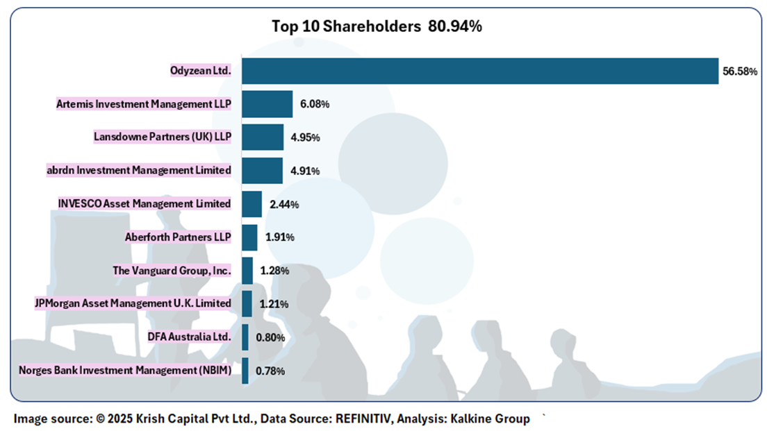 The top 10 shareholders together form ~80.94% of the total shareholding. Odyzean Ltd. & Artemis Investment Management LLP hold a maximum stake in the company at ~56.58% and ~6.08%, respectively.