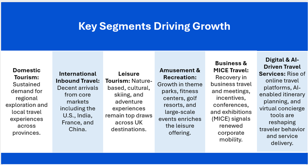 The UK travel and leisure industry is showing signs of recovery, with growth spread across luxury, adventure, and domestic travel segments. However, it continues to encounter challenges such as rising policy-related expenses, inflation, workforce shortages, and environmental risks. To sustain this positive trajectory, industry players should prioritise boosting visitor spending, adopting digital and experience-led innovations, engaging new customer segments, and addressing broader economic and cost-related pressures.