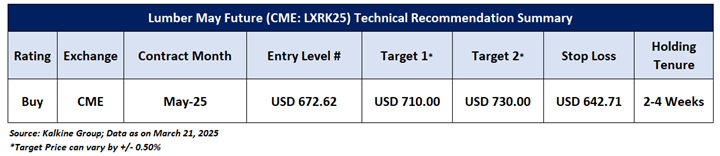 Having understood the global commodities performance over the past week, taking cues from major global economic events, and based on technical analysis, noted below is the recommendation with the generic insights, entry price, target prices, and stop-loss Lumber May Future (CME: LXRK25) for the next 2-4 weeks duration: