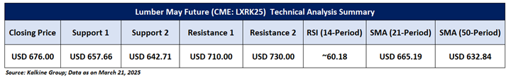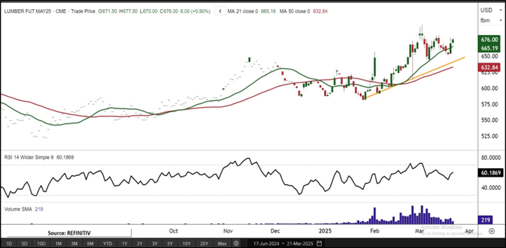 Price Action and Technical Indicator Analysis: Lumber futures for May are currently trading above a critical horizontal support level and an ascending trendline, bolstered by a bullish candlestick pattern, signalling the potential for continued upward movement. A solid support level visible on the daily chart further strengthens the case for ongoing gains. The Relative Strength Index (RSI) stands at 60.18, indicating positive momentum and healthy market sentiment. Additionally, the 21-period and 50-period Simple Moving Averages (SMAs) offer solid short-term support, helping to sustain the bullish outlook. With these technical indicators suggesting sustained growth, lumber futures appear poised for further gains unless resistance levels present significant challenges. Investors should closely monitor these key levels for signs of continued upward momentum.
