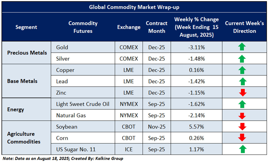 Global commodity prices were mixed last week as markets reacted to macroeconomic uncertainty and shifting tariff sentiments. Precious metals held steady, with gold and silver consolidating near recent highs amid cautious sentiment and changing rate expectations. Crude oil declined on global demand concerns and trade-related pressures, while natural gas fell sharply due to oversupply. Copper moved up, supported by renewed industrial demand, while agricultural commodities traded sideways on stable consumption and favorable weather. Overall, market sentiment remained cautious ahead of key economic data and trade policy updates.