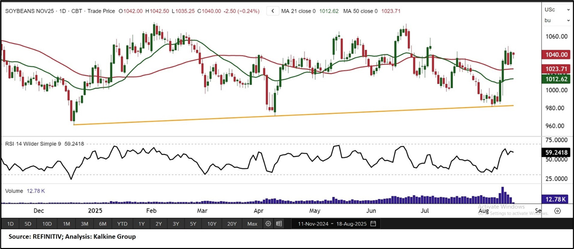 Price Action and Technical Indicator Analysis: November soybean futures are showing strength, trading above a key horizontal trendline and rebounding from the 50-period Simple Moving Average with rising volumes. The 21-period SMA below current levels offers near-term support, reinforcing cautious optimism. The RSI at 59.24 signals improving momentum and hints at bullish divergence. Sustaining above the support zone may help maintain the positive bias, while a decisive breakout above resistance could unlock further upside potential. Broader market sentiment will remain a crucial driver for direction.