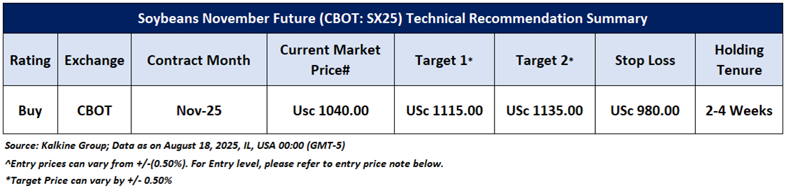 Having understood the global commodities’ performance over the past week, taking cues from major global economic events, and based on technical analysis, noted below is the recommendation with generic insights, entry price, target prices, and stop-loss Soybeans November Future (CBOT: SX25) for the next 2-4-week duration: