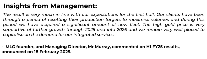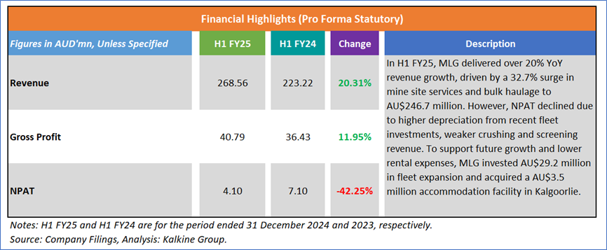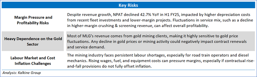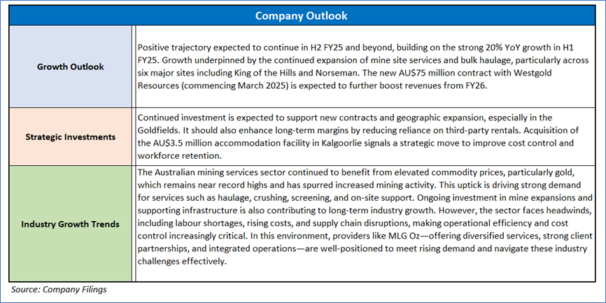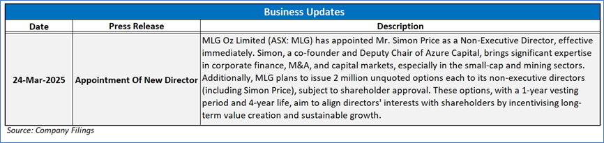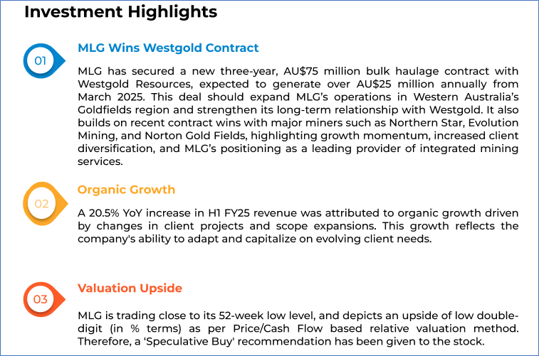 1.1 Company Overview: MLG Oz Limited (ASX: MLG) is a Kalgoorlie-based mining services and resource asset management company, specializing in supporting ore processing operations across gold, iron ore, and other base metals in Western Australia and the Northern Territory. Founded by Managing Director Murray Leahy, MLG operates under an integrated business model, offering Civil & Construction, Crushing & Screening, Bulk Haulage & Site Services, and supplying Open Pit Mining & Construction Materials from its regional quarries. Kalkine’s Resources Report covers the Investment Highlights, Management Insights, Key Financial Metrics, Risks, Technical Analysis along with the Valuation, Target Price, and Recommendation on the stock.