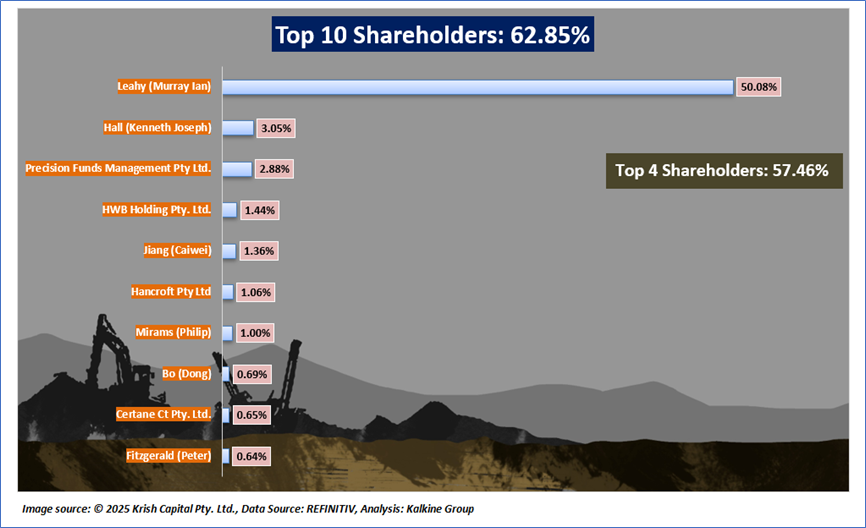 The top 10 shareholders together form ~62.85% of the total shareholding. Leahy (Murray Ian) and Hall (Kenneth Joseph) hold maximum stakes in the company at 50.08% and 3.05%, respectively.